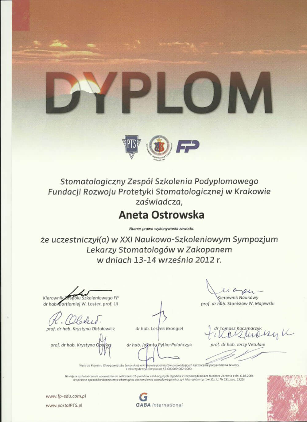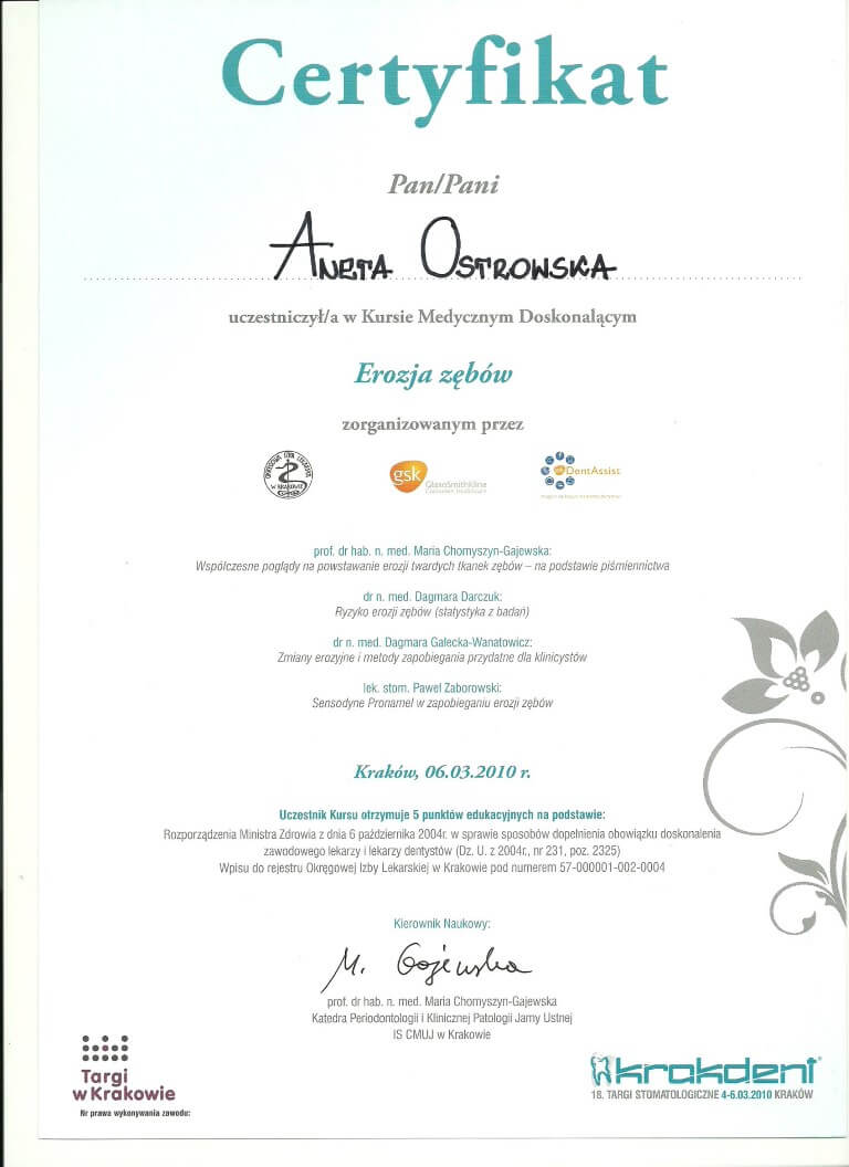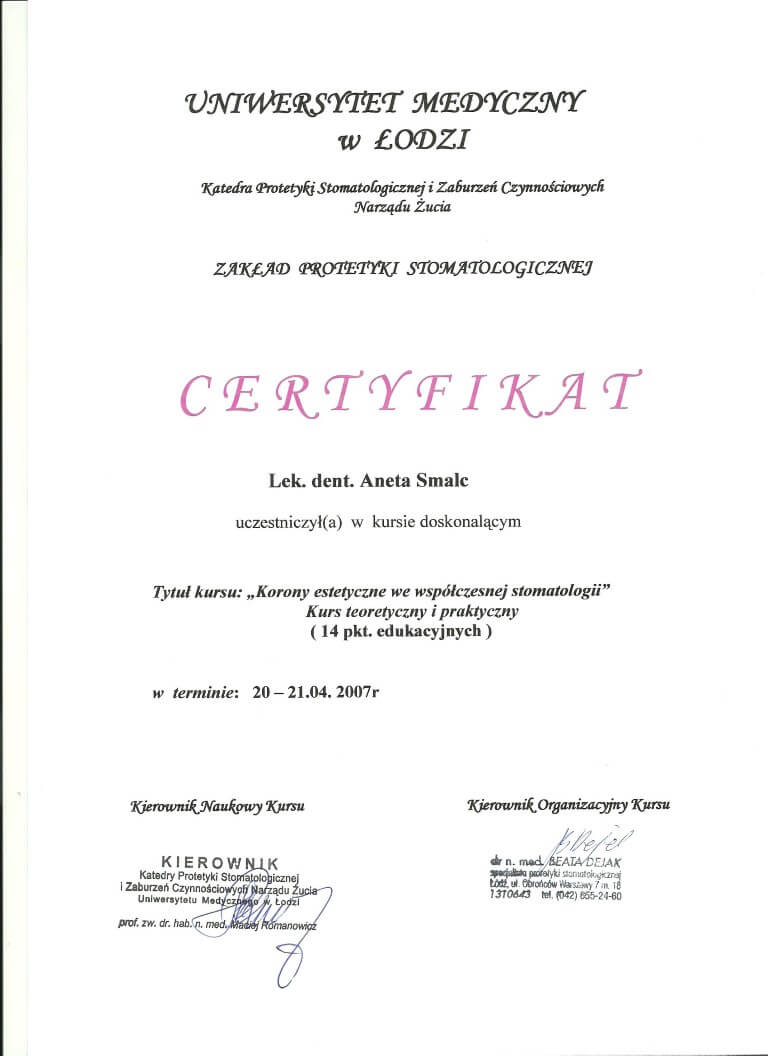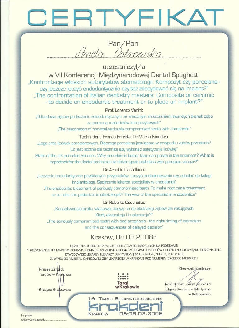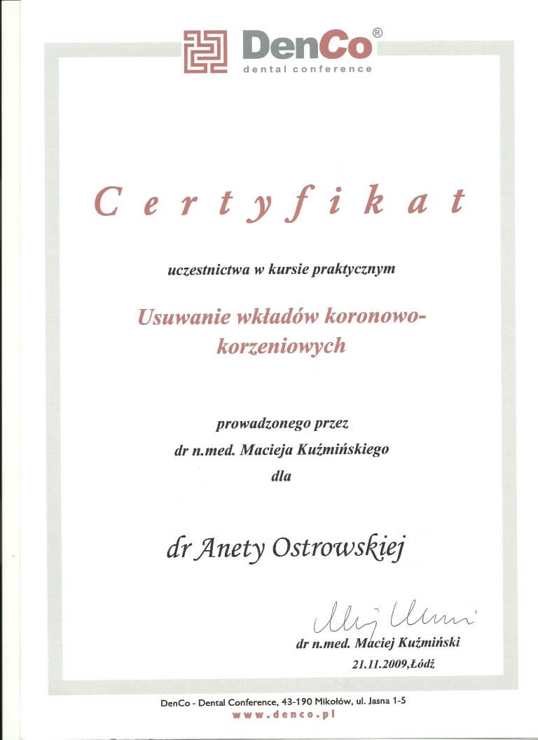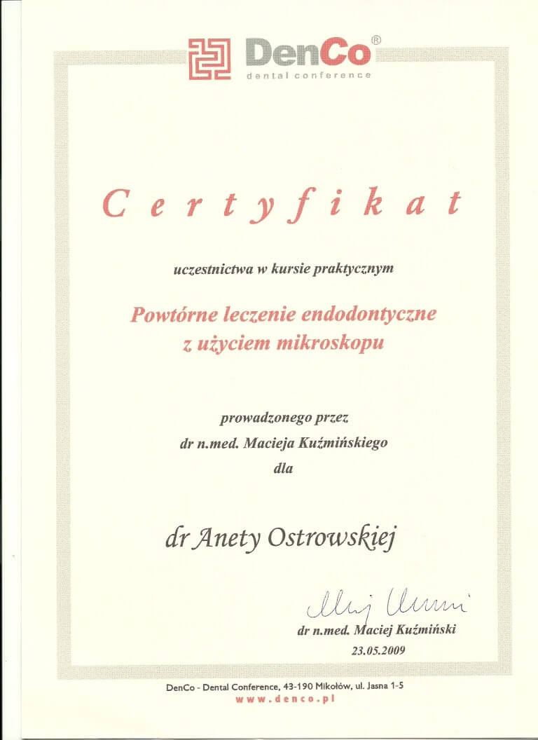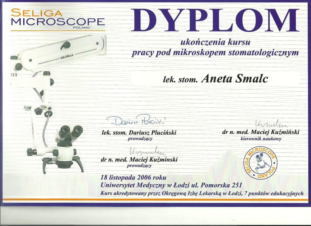 Doktor Aneta Jankowska współpracuje z gabinetem Kuźmińscy Stomatologia od 2006 roku. Ukończyła Uniwersytet Medyczny w Łodzi, gdzie uzyskała tytuł doktora nauk medycznych oraz ukończyła specjalizację w stomatologii zachowawczej z endodoncją. Jej zawodowym priorytetem jest profesjonalizm, dokładność i precyzja, dlatego zawsze przeprowadza leczenie kanałowe przy użyciu mikroskopu.