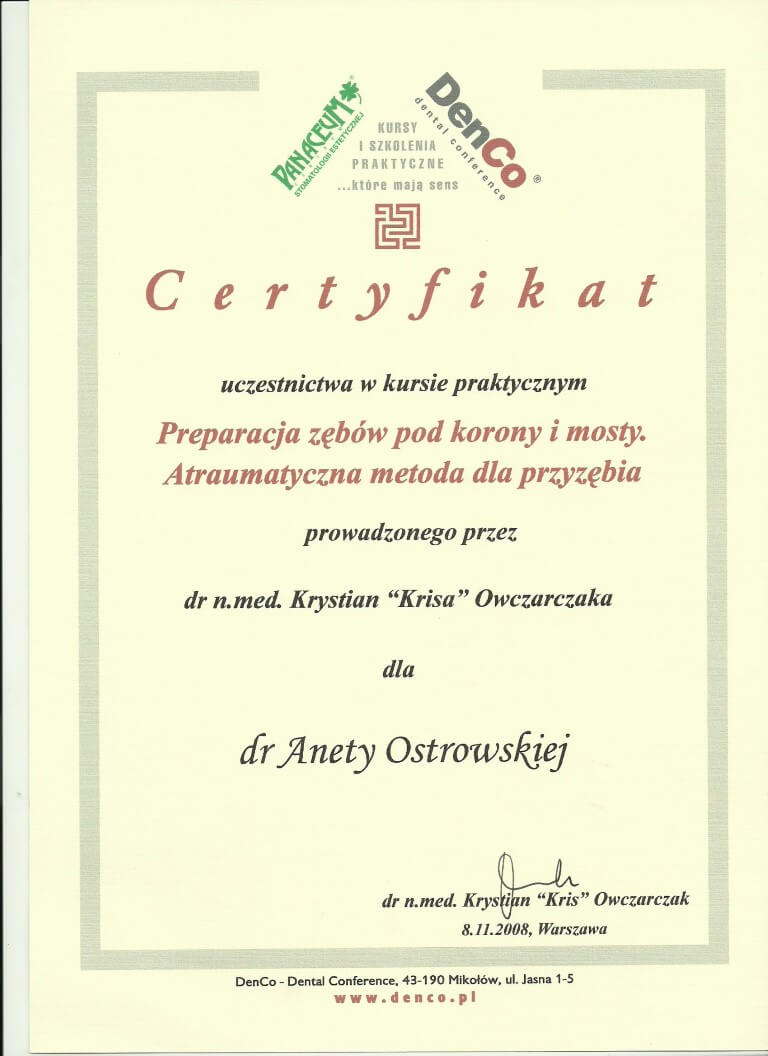 Jest bardzo ciepłą i uśmiechniętą osobą, ma w sobie ogromne pokłady cierpliwości, dzięki czemu wizyta u niej przebiega w bardzo miłej atmosferze. Zawsze stara się dokładnie wytłumaczyć Pacjentowi istotę problemu. Na co dzień zajmuje się endodoncją, protetyką i stomatologią estetyczną osób dorosłych.