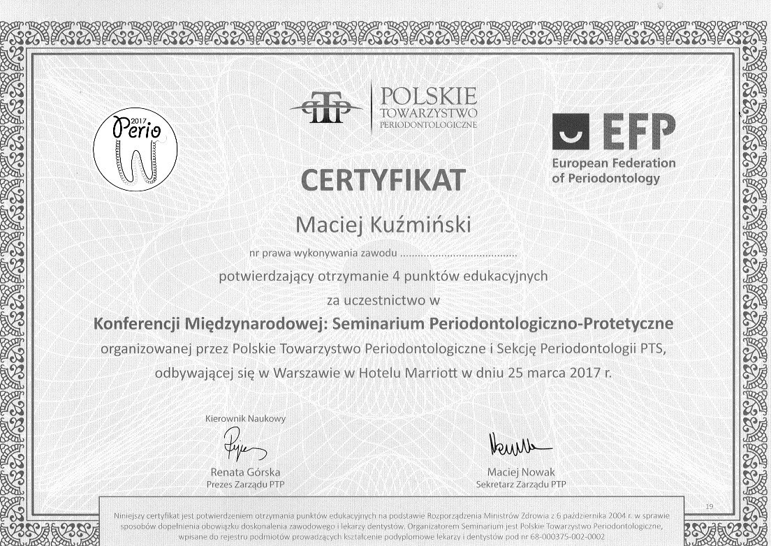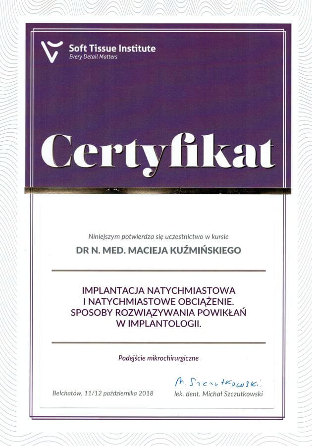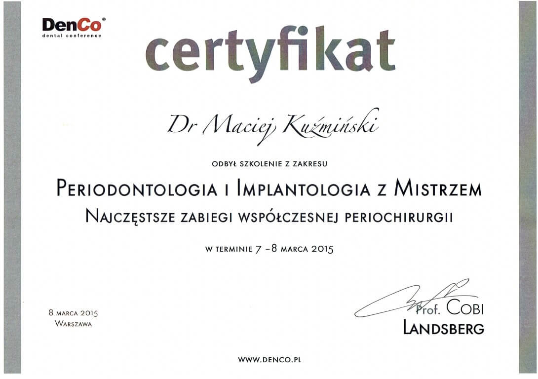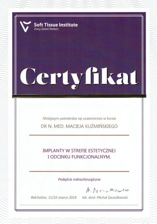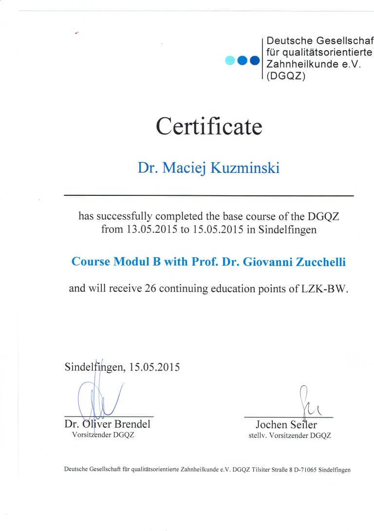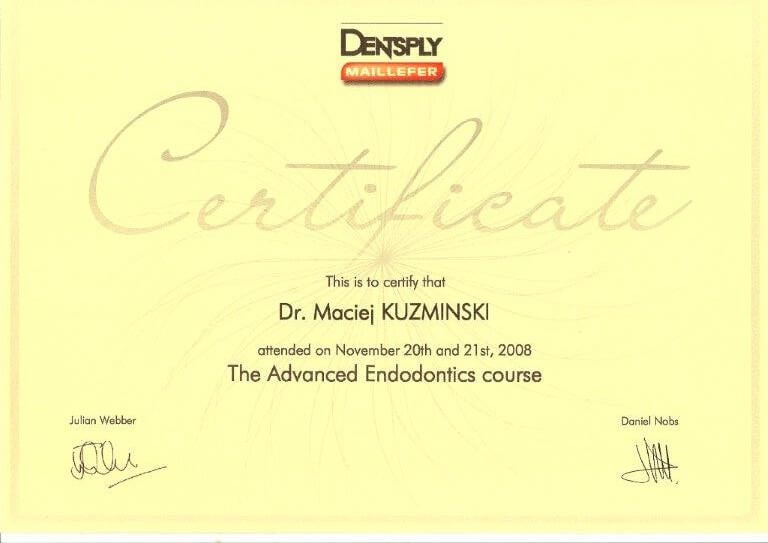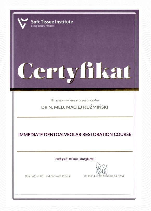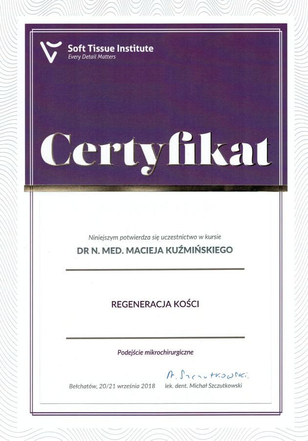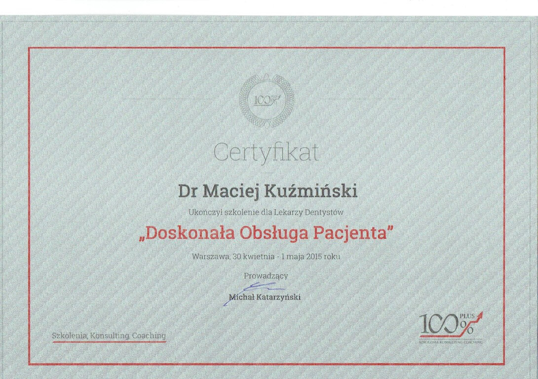 Dr n. med. Maciej Kuźmiński posiada tytuł specjalisty stomatologii zachowawczej z endodoncją oraz stomatologii ogólnej. Stale pogłębia swoją wiedzę, uczestnicząc w licznych konferencjach i zaawansowanych szkoleniach w Niemczech, Wielkiej Brytanii czy Szwajcarii.