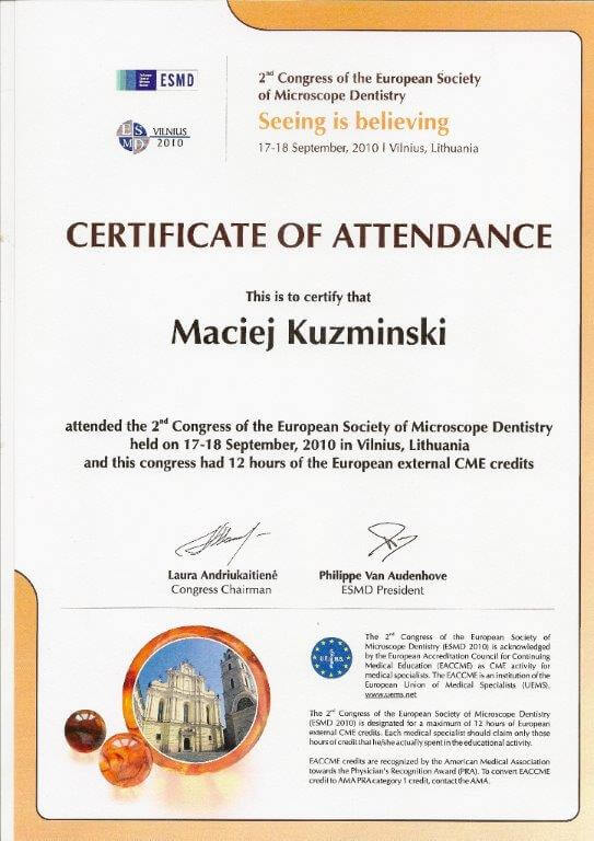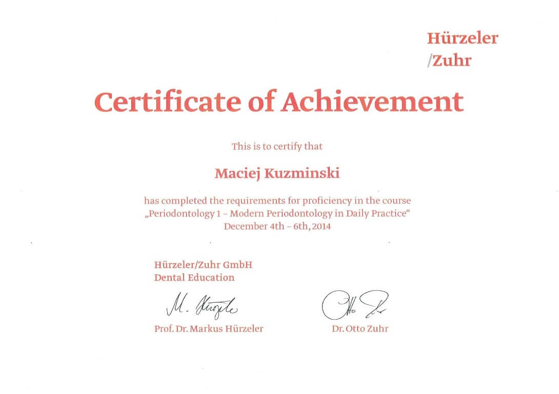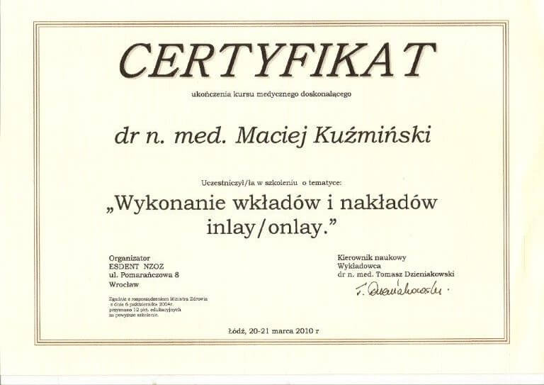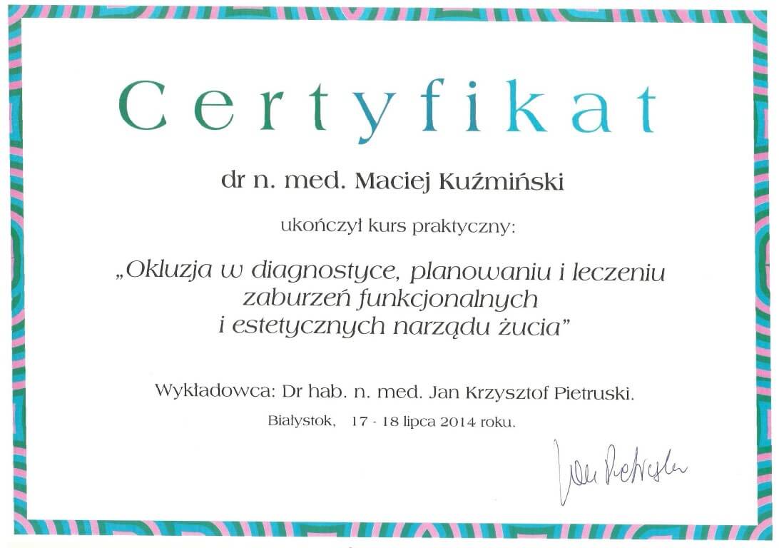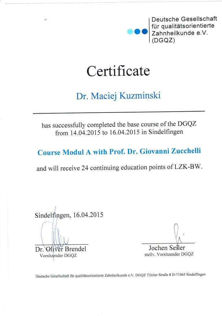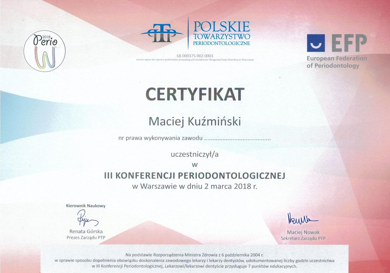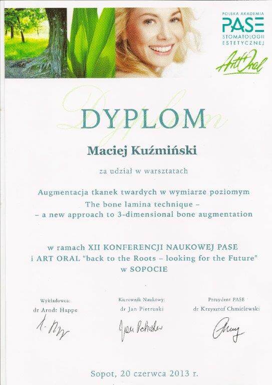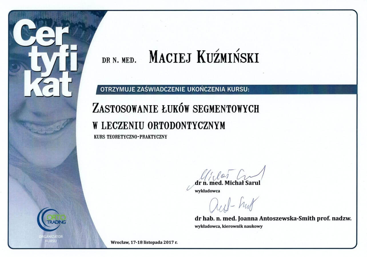 Dr n. med. Maciej Kuźmiński posiada tytuł specjalisty stomatologii zachowawczej z endodoncją oraz stomatologii ogólnej. Stale pogłębia swoją wiedzę, uczestnicząc w licznych konferencjach i zaawansowanych szkoleniach w Niemczech, Wielkiej Brytanii czy Szwajcarii.