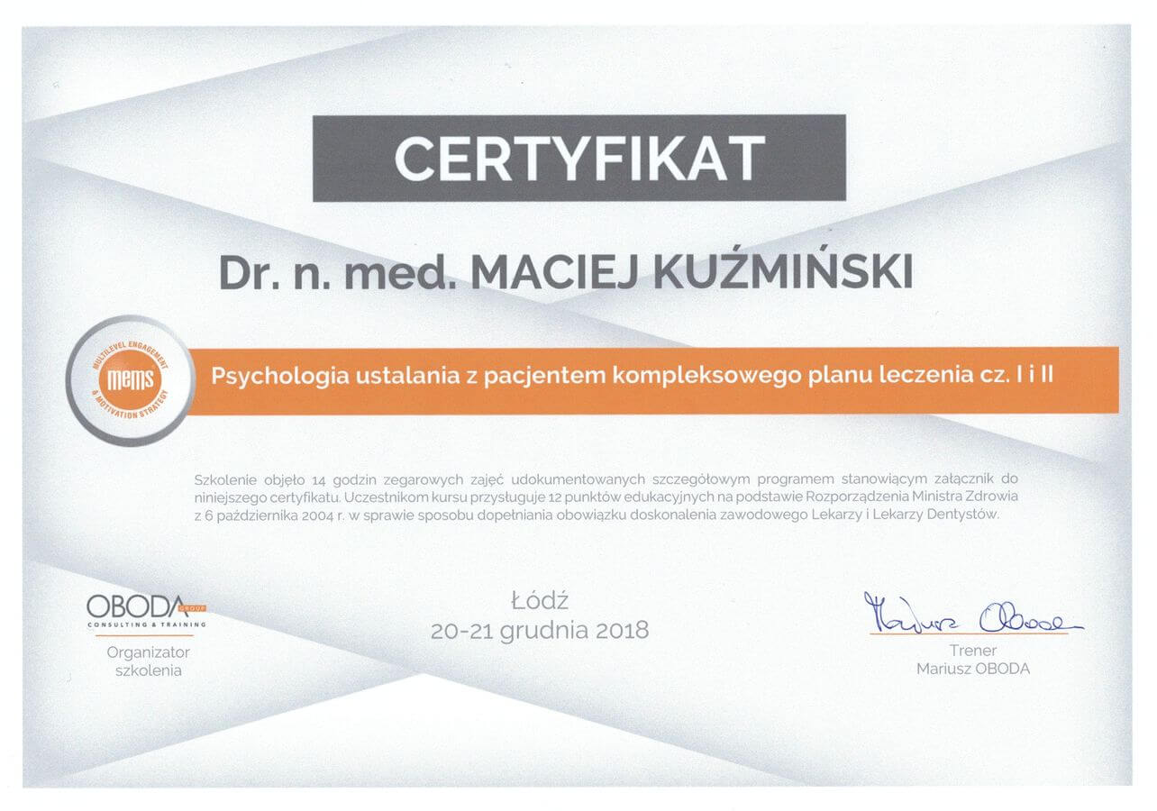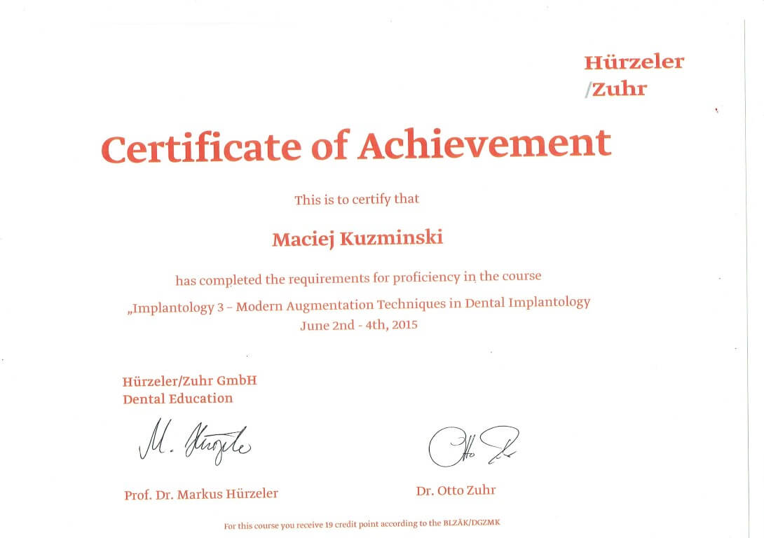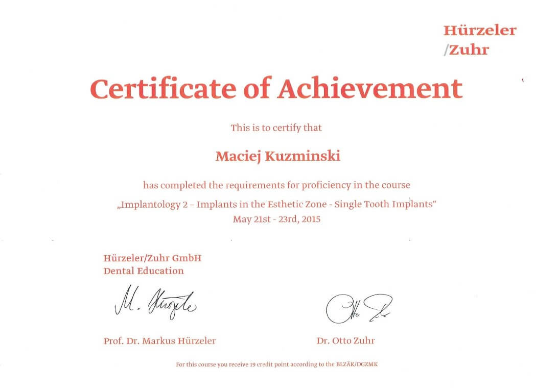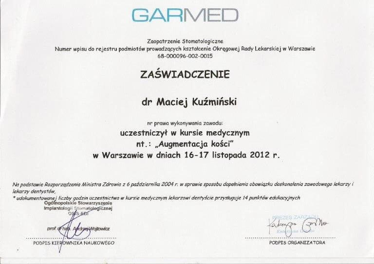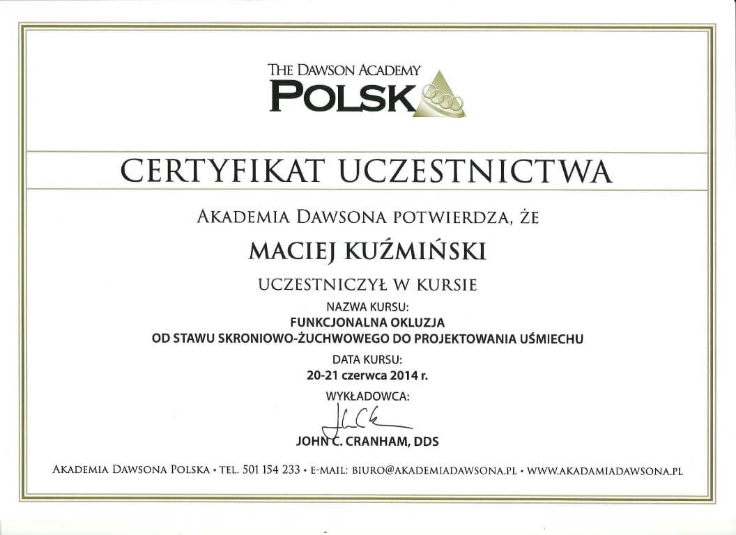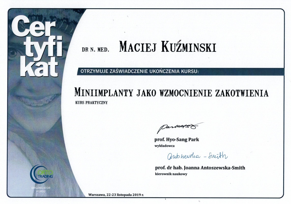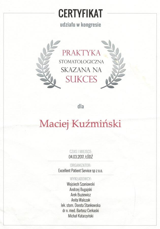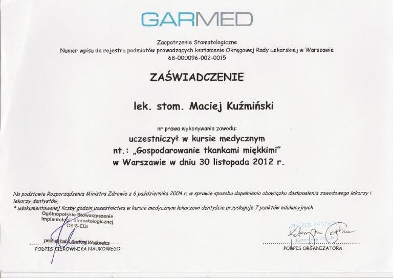 Dr n. med. Maciej Kuźmiński posiada tytuł specjalisty stomatologii zachowawczej z endodoncją oraz stomatologii ogólnej. Stale pogłębia swoją wiedzę, uczestnicząc w licznych konferencjach i zaawansowanych szkoleniach w Niemczech, Wielkiej Brytanii czy Szwajcarii.