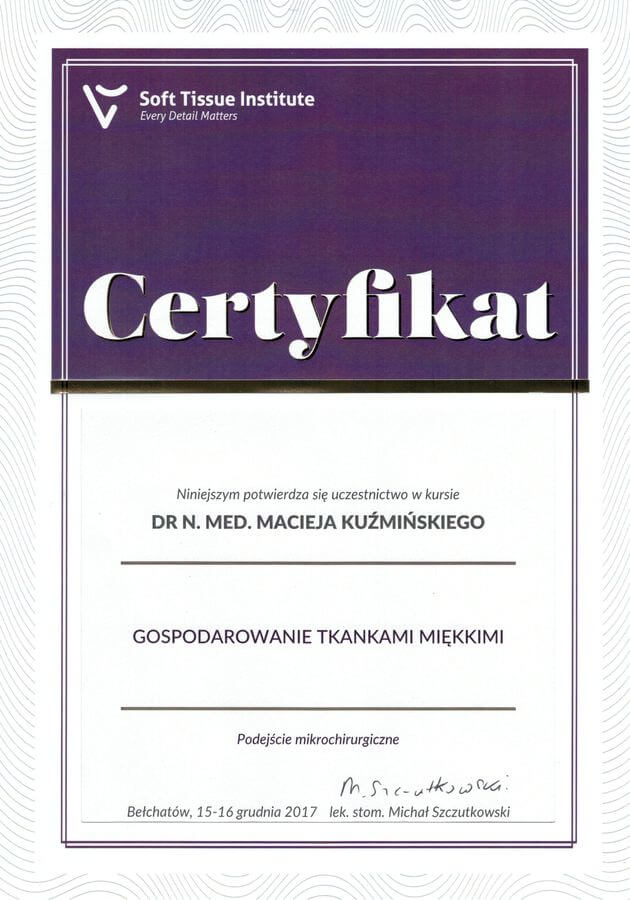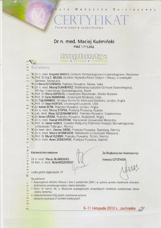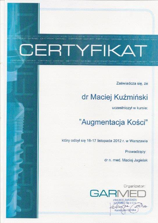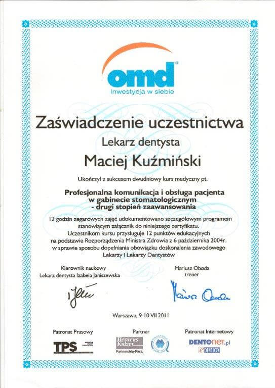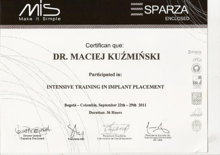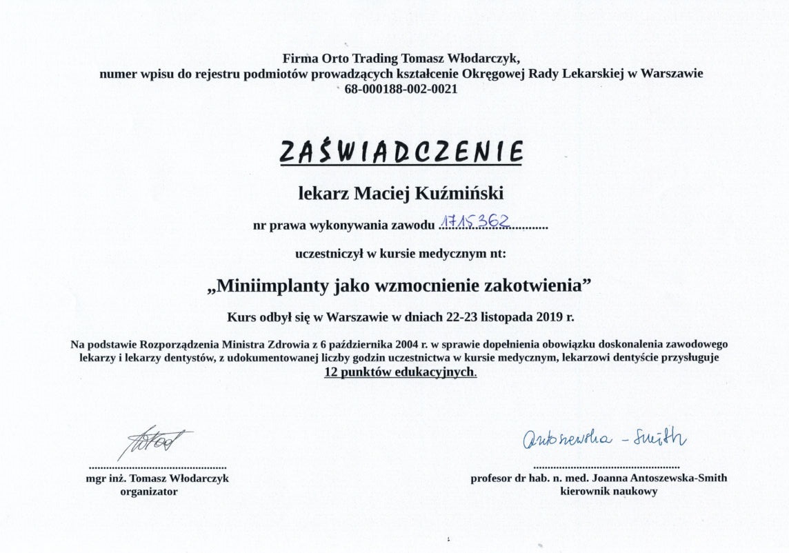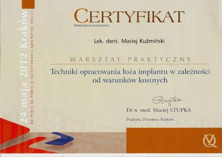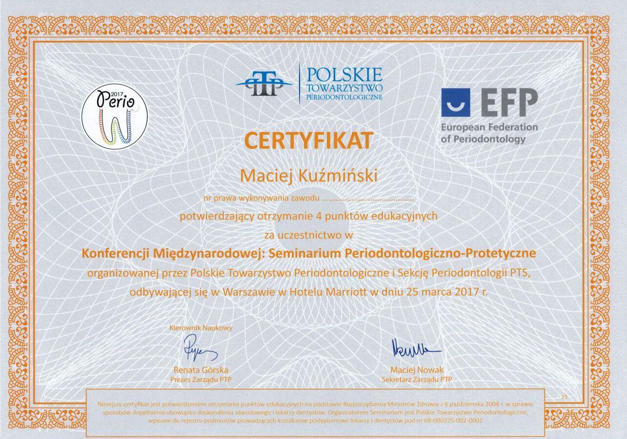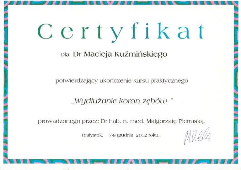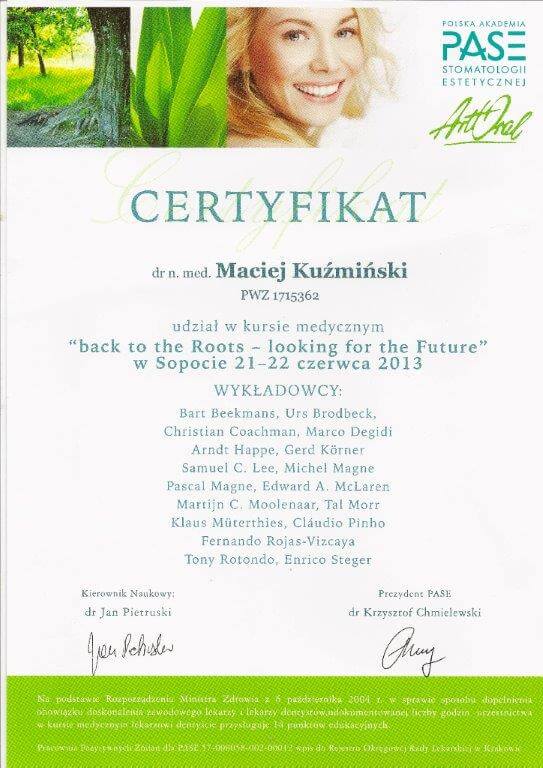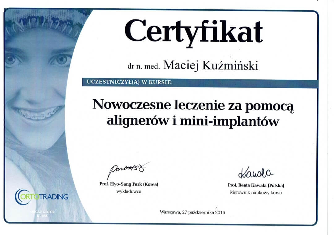 Dr n. med. Maciej Kuźmiński posiada tytuł specjalisty stomatologii zachowawczej z endodoncją oraz stomatologii ogólnej. Stale pogłębia swoją wiedzę, uczestnicząc w licznych konferencjach i zaawansowanych szkoleniach w Niemczech, Wielkiej Brytanii czy Szwajcarii.