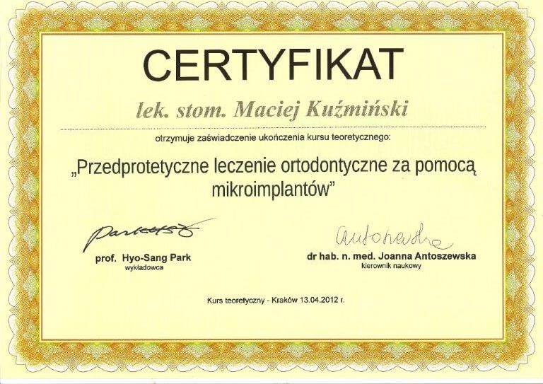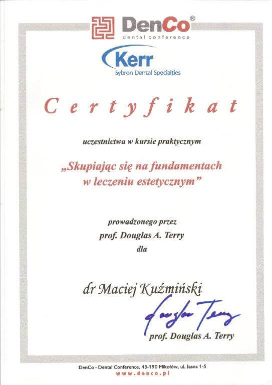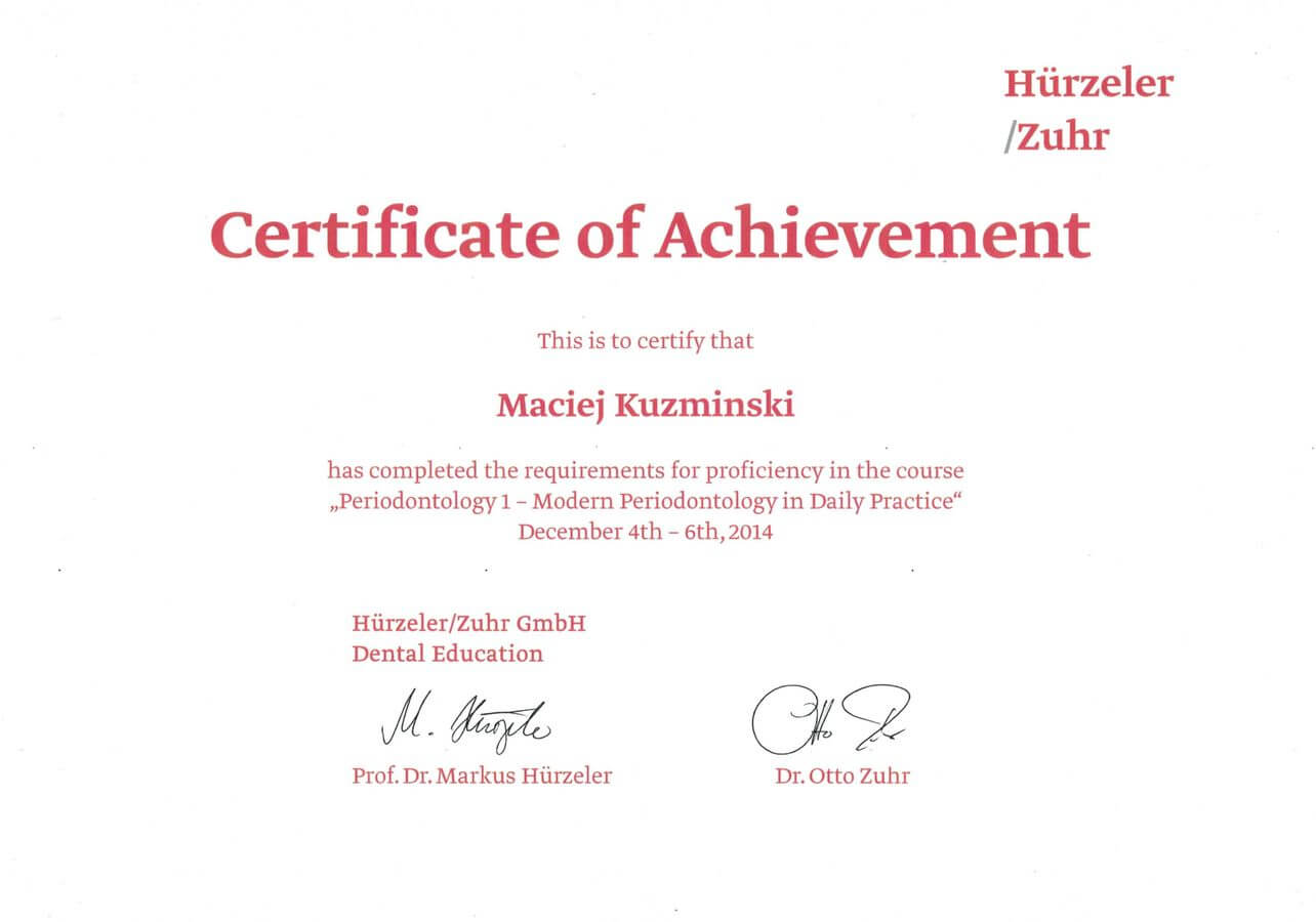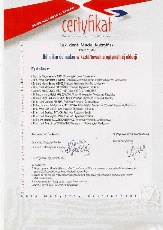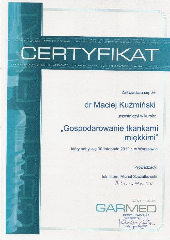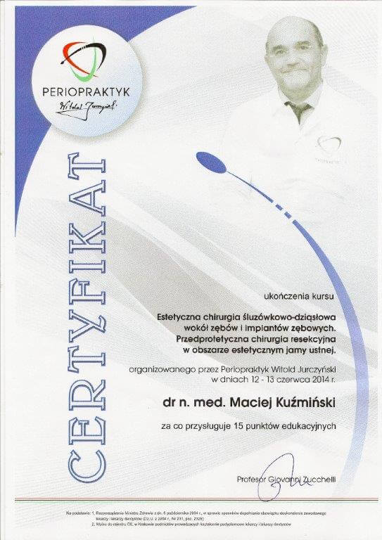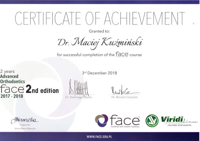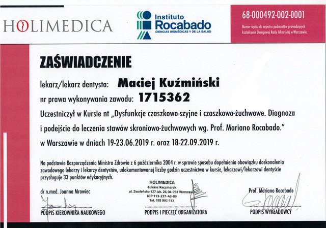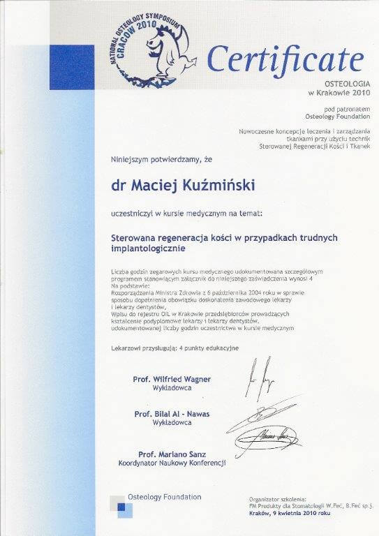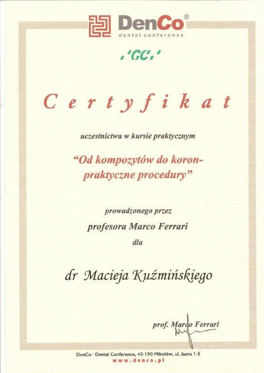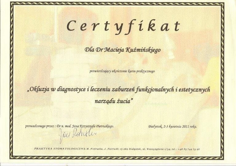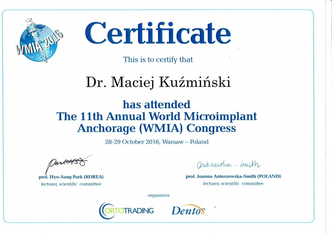 Dr n. med. Maciej Kuźmiński posiada tytuł specjalisty stomatologii zachowawczej z endodoncją oraz stomatologii ogólnej. Stale pogłębia swoją wiedzę, uczestnicząc w licznych konferencjach i zaawansowanych szkoleniach w Niemczech, Wielkiej Brytanii czy Szwajcarii.